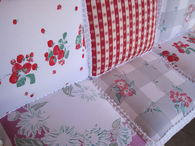 using vintage tablecloths................ at a suggestion of a dear friend.............and an old white vintage chenille bedspread..........for the sides..............I painted him..........white of course.............sanded and waxed...................this has to be the most comfortable couch I have ever sat on...................or crashed for a much needed nap!.................:)